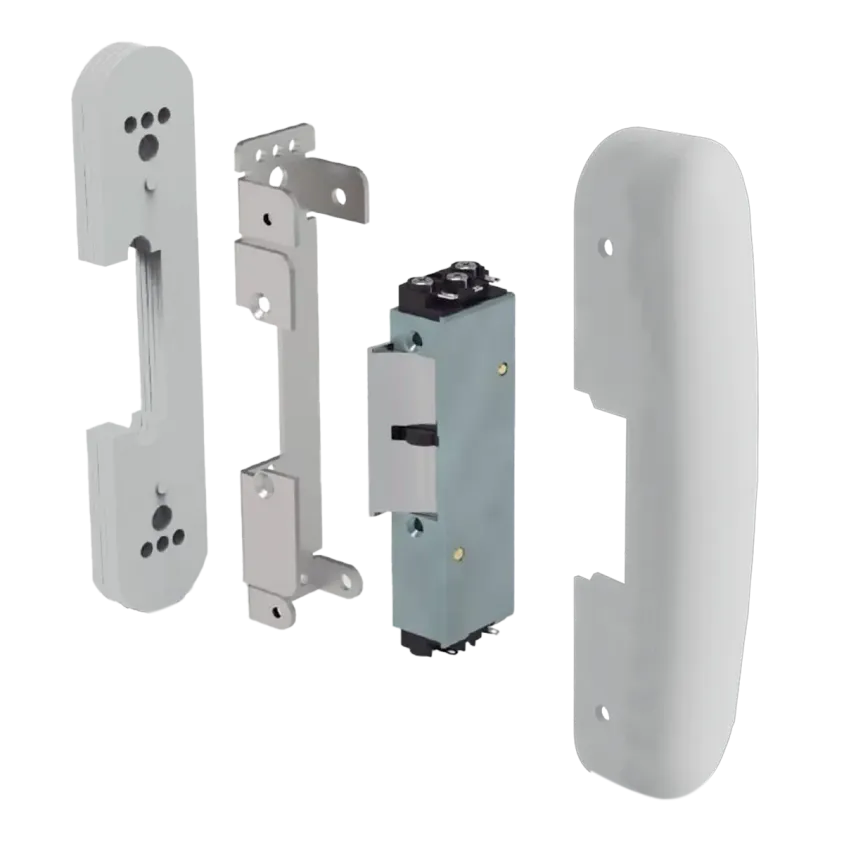 + de détailsGâche électrique 34A en applique, pour barre anti panique, 6500 N, à rupture de courant, 24V DC, diode transil TVS intégrée, finition blanc. DISPONIBLE SUR DEMANDE : contactez-nous pour plus d’information