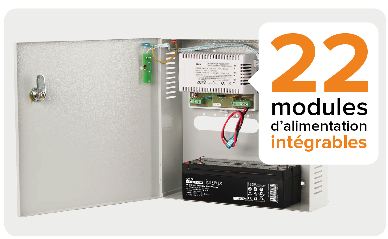 Avec nos alimentations chargeurs en coffret métal PSX, vous pouvez intégrer jusqu'à 22 modules d'alimentation. En 12V DC, 24V DC, 48V DC, bi-tension, multivoies de 1.5 à 20A, pour couvrir l'ensemble de toutes les configurations d'installations.
